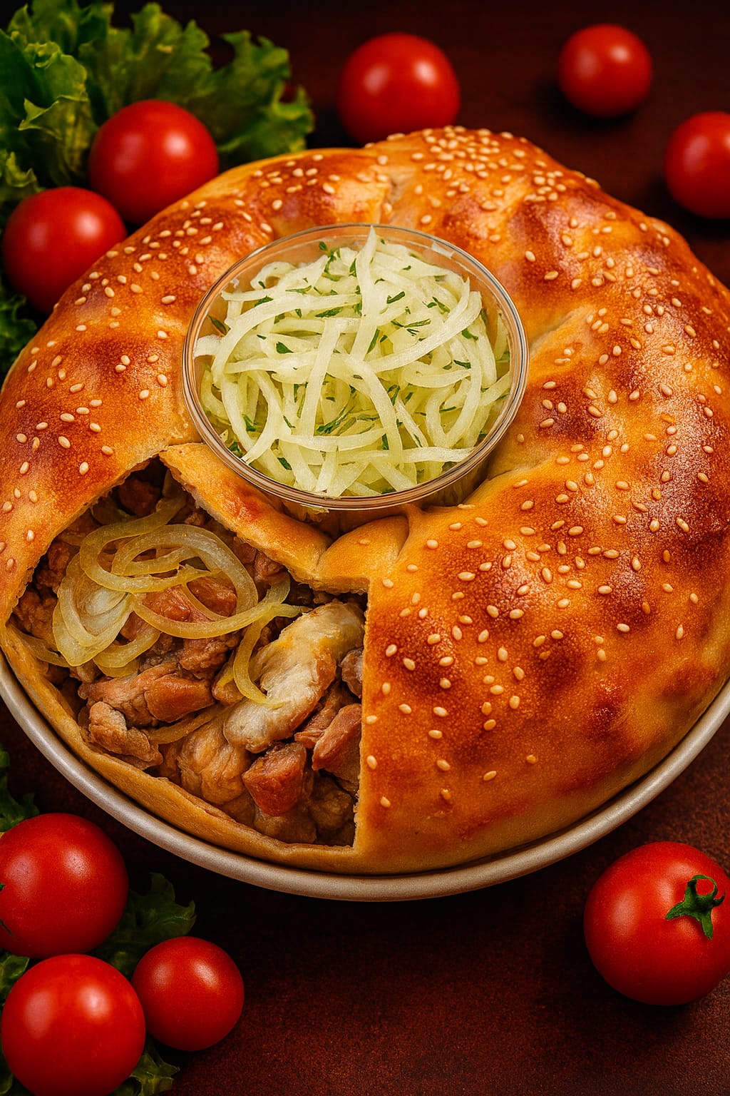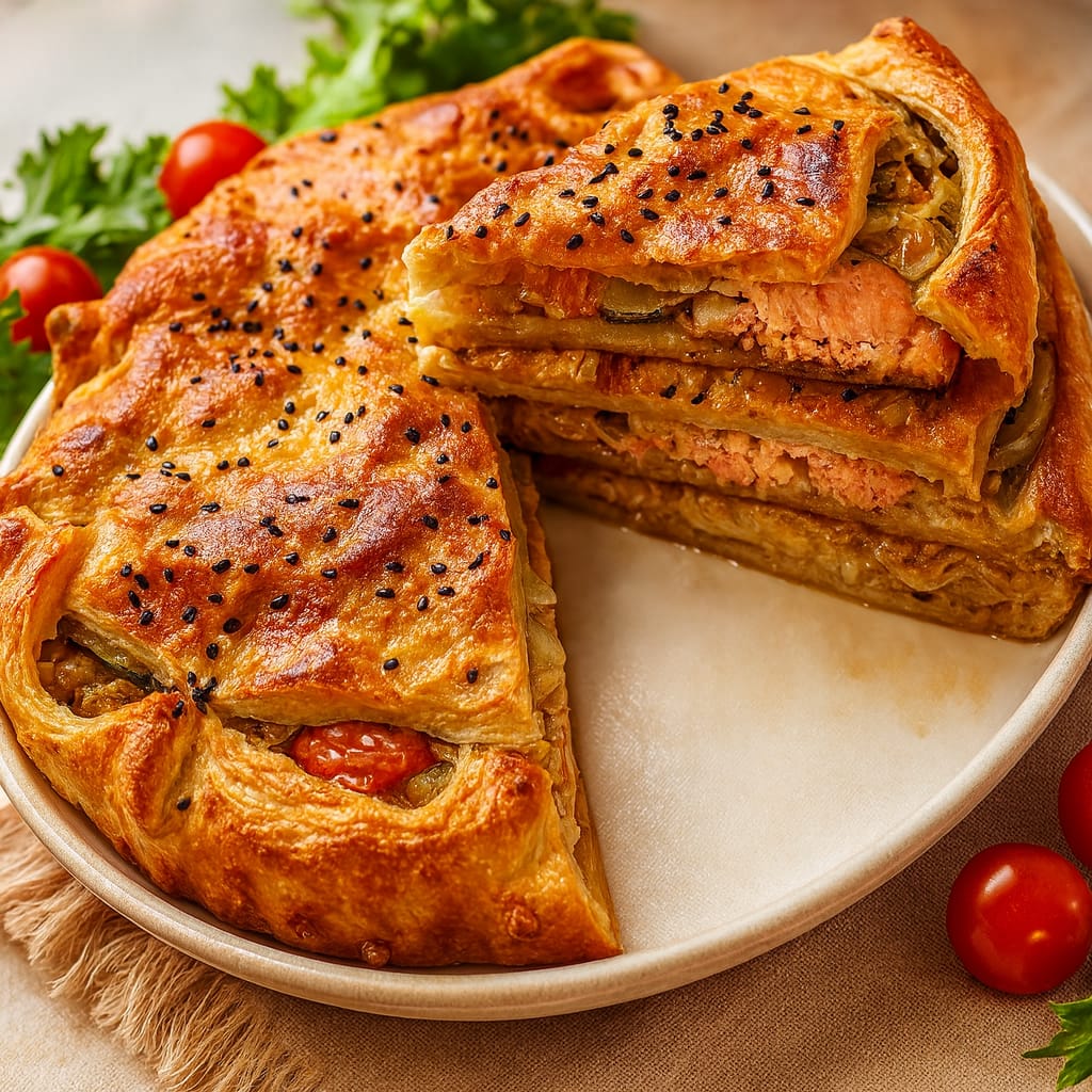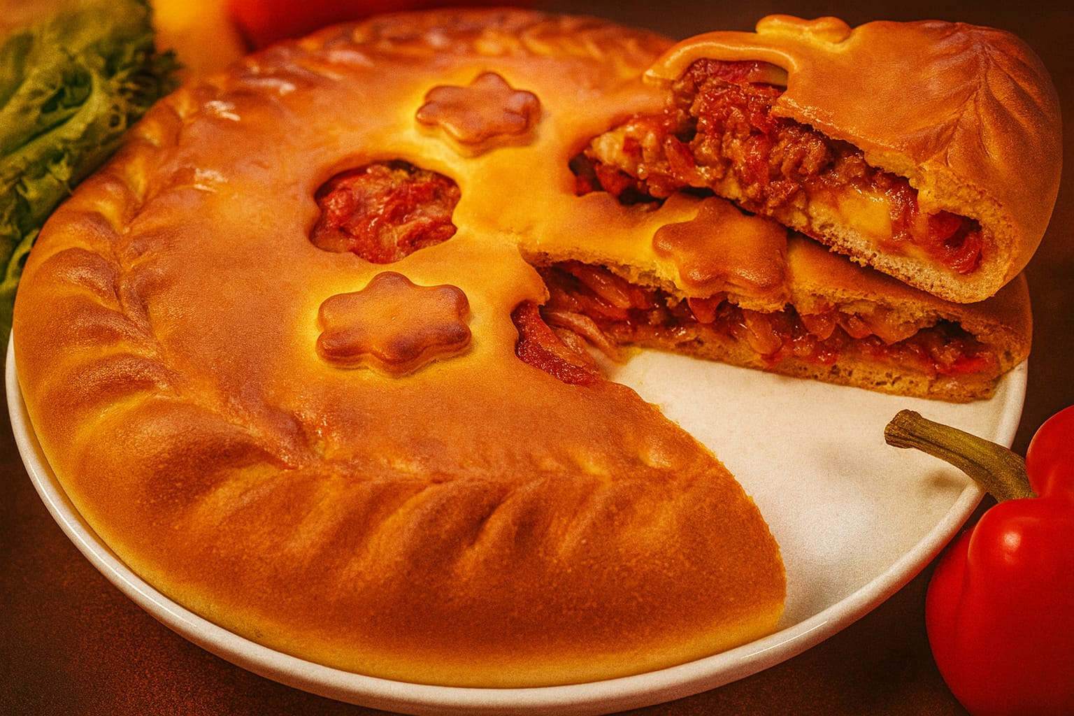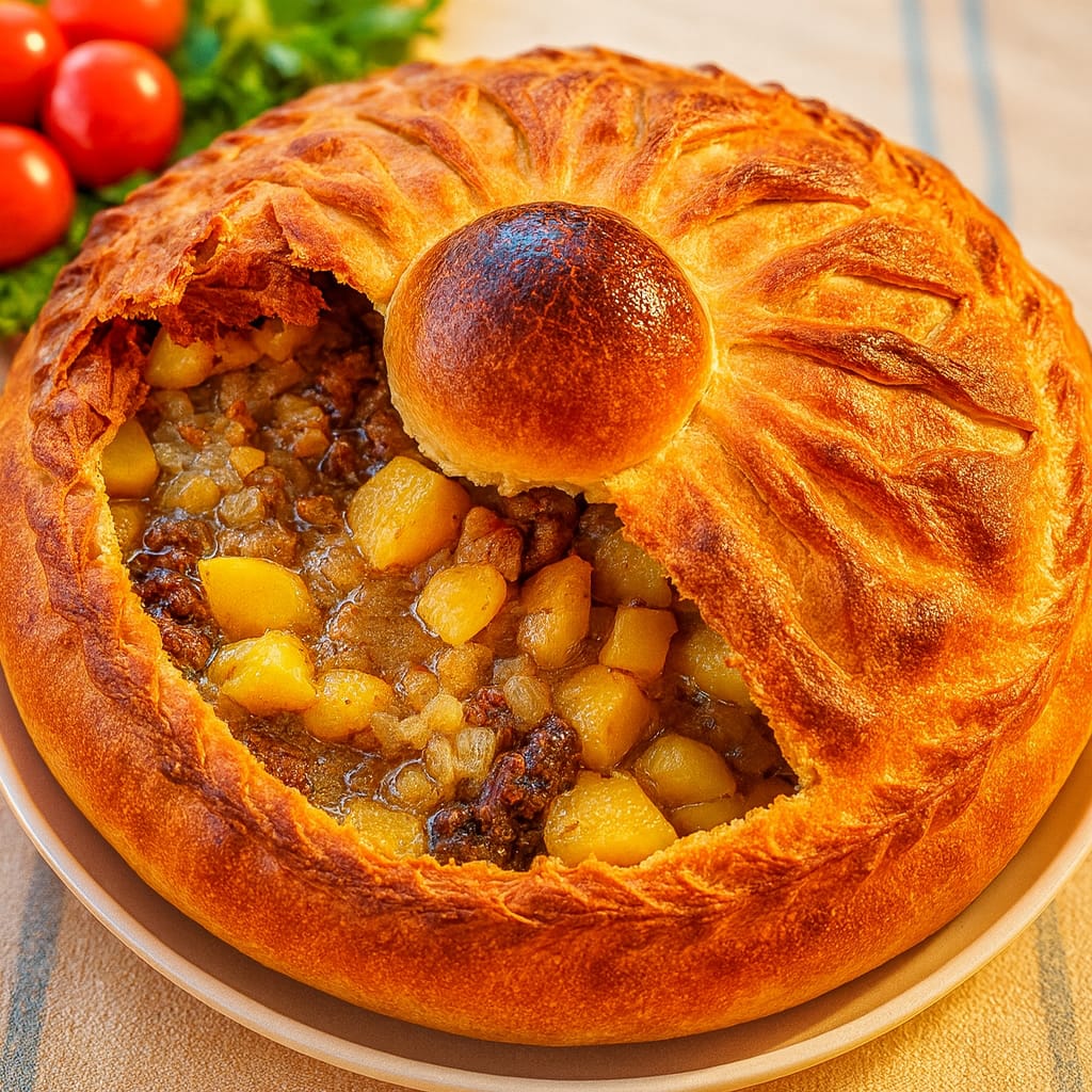 Татарский национальный пирог с сочной начинкой из мяса и картофеля, запечённый в румяном хрустящем тесте. Символ домашнего уюта, щедрости и праздника.