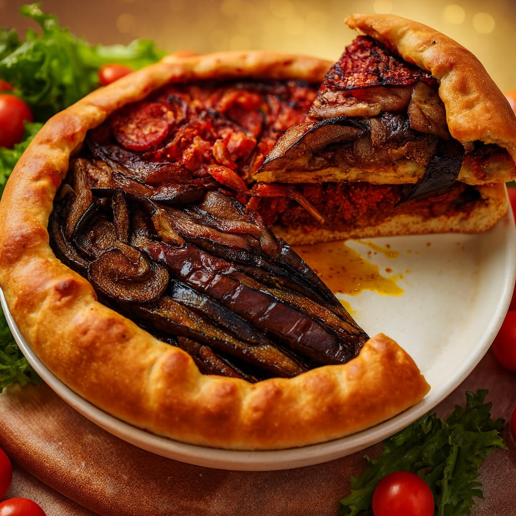 Мясной пирог с баклажанами и томатами — сочное сочетание нежного мяса, пряных овощей и румяного теста. Две стороны, два вкуса — гармония в каждом кусочке.