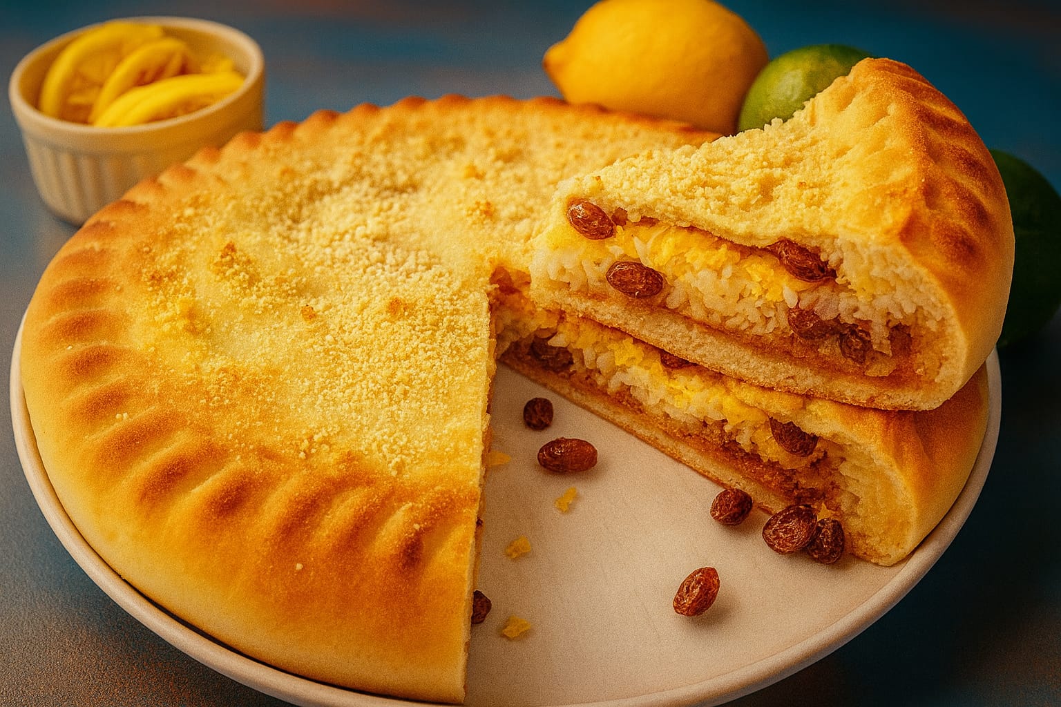 Румяный татарский пирог с рассыпчатым рисом, нежным творогом и сладкими сухофруктами, пропитанный ароматом сливочного масла и теплом домашнего уюта.