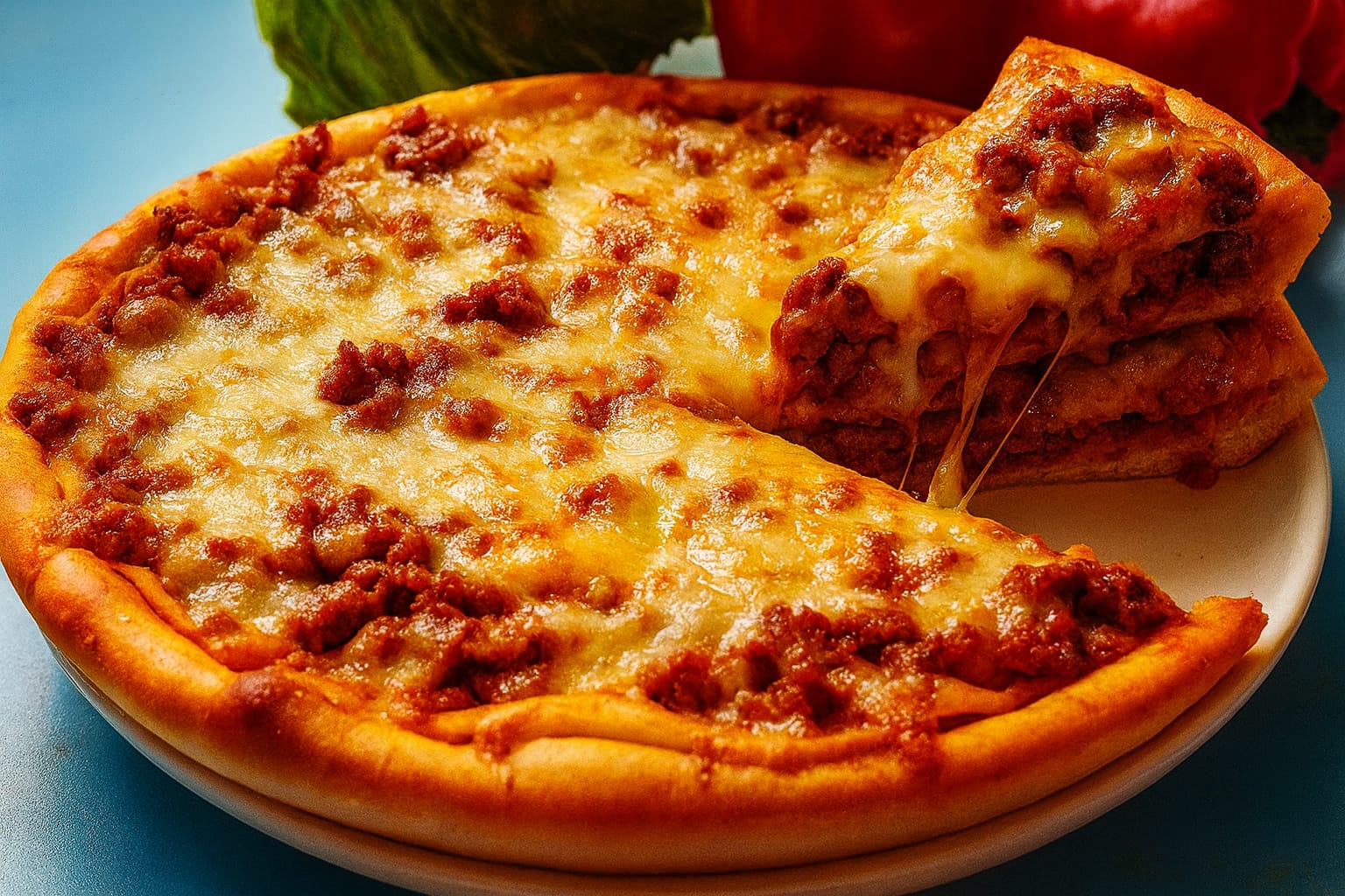 Пышный пирог с рубленной говядиной, болгарским перцем, луком и томатами — сочный, ароматный и по-домашнему вкусный.